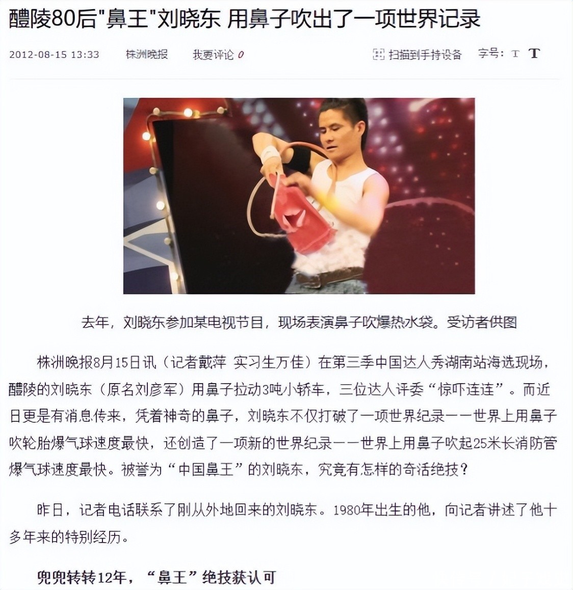 2012-08-15——株洲晚报——醴陵80后"鼻王"刘晓东 用鼻子吹出了一项世界记录